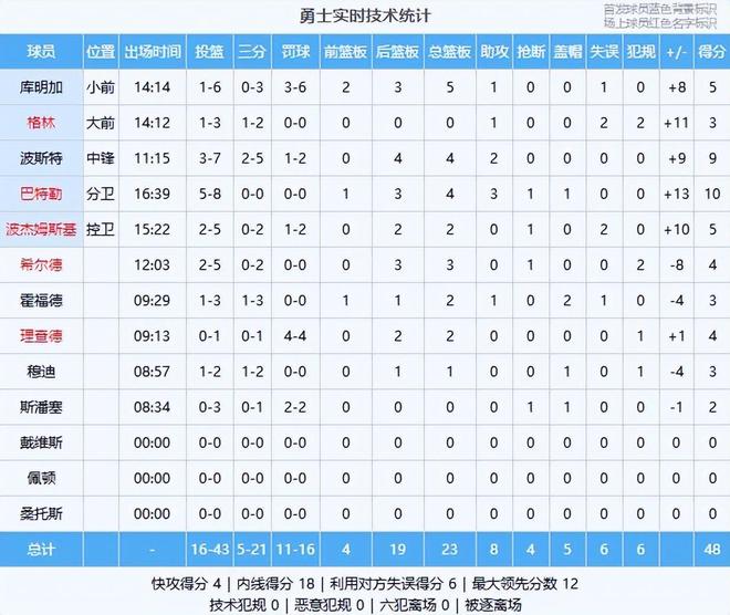 杰克逊8分3板、莫里斯8分2板3助、沃克6分、厄尔5分6板1助、布拉德利4分6板、赫夫4分2板2帽、内姆哈德4分1板5助2断、马丁2分3板2助2断、谢泼德3板